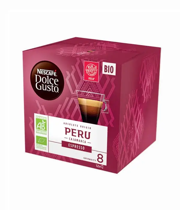 Kapsułki Nescafé Dolce Gusto Peru to wysokiej jakości kawa z ziaren 100% Arabica pochodzących z ekologicznych upraw w Peru. Charakteryzuje się intensywnym, zbalansowanym smakiem z delikatnymi nutami czekolady i owoców. Idealna do ekspresów Dolce Gusto. To doskonały wybór dla miłośników aromatycznej i zrównoważonej kawy w kapsułkach.