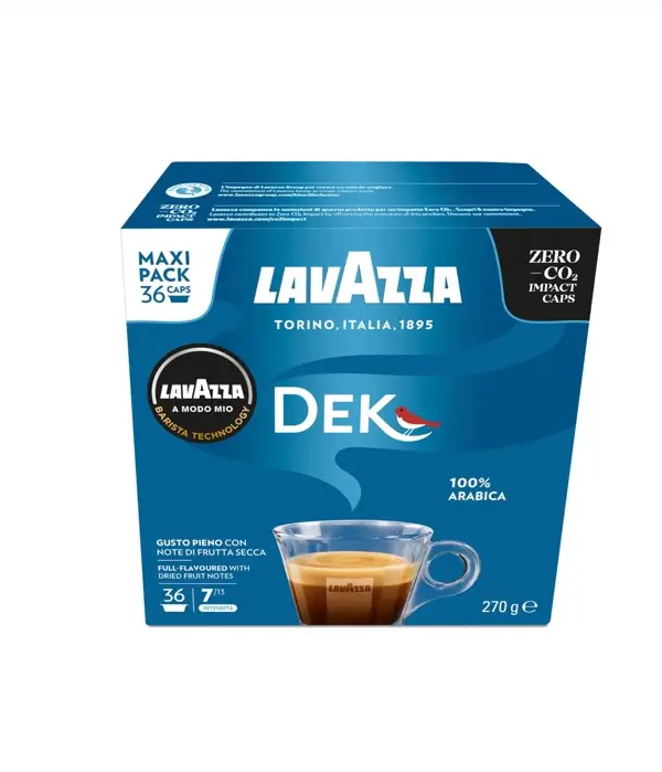 Kapsułki Lavazza A Modo Mio Decaffeinato to bezkofeinowa kawa o delikatnym, łagodnym smaku i bogatym aromacie. Idealna dla osób ceniących smak włoskiego espresso bez kofeiny. Doskonała do ekspresów A Modo Mio, zapewnia komfort i wyjątkową jakość w każdej filiżance.