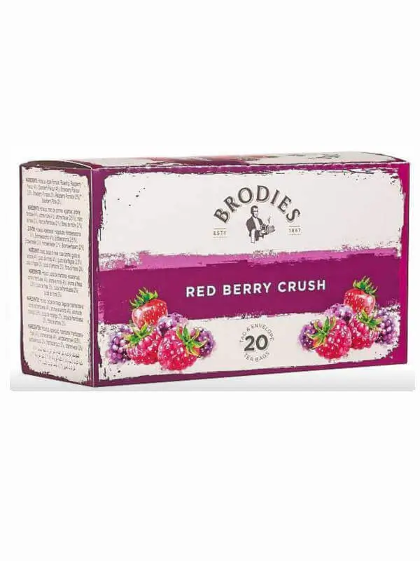 Brodies Red Berry Crush to intensywnie owocowa hibiskus herbata, łącząca smak czerwonych owoców z naturalną kwasowością hibiskusa. Orzeźwiająca, aromatyczna i bezkofeinowa – idealna zarówno na ciepło, jak i na zimno. Doskonały wybór dla miłośników herbat z hibiskusem.